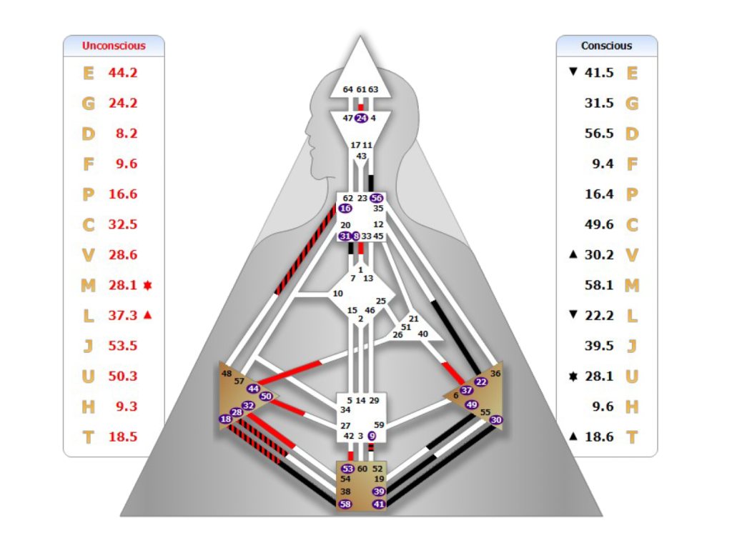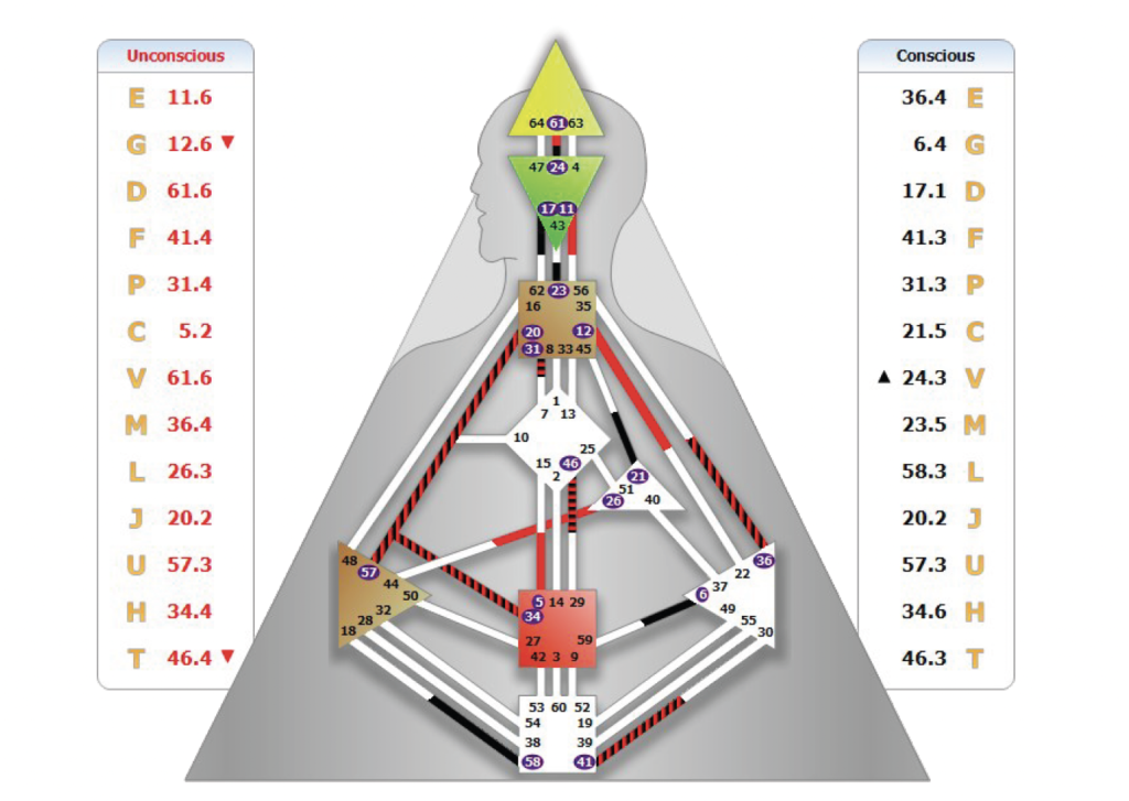 そして、右下にある横向きの三角、これは感情のセンターですが、ここは色がついている=定義されているので、私は感受性が強く、気分の波も激しいデザインを持っています。
