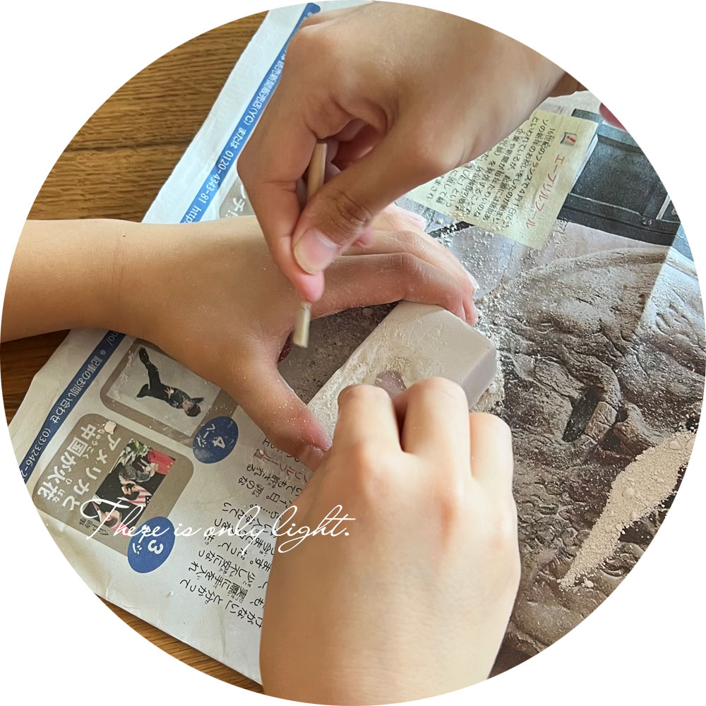 これは、たまたま今日、天然石の発掘キットで遊んでいた時の様子。